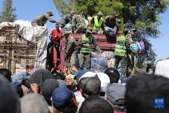 9月11日,救援人員在摩洛哥馬拉喀什南部的艾米茲米茲村分發(fā)救災(zāi)物資。新華社記者王東震攝