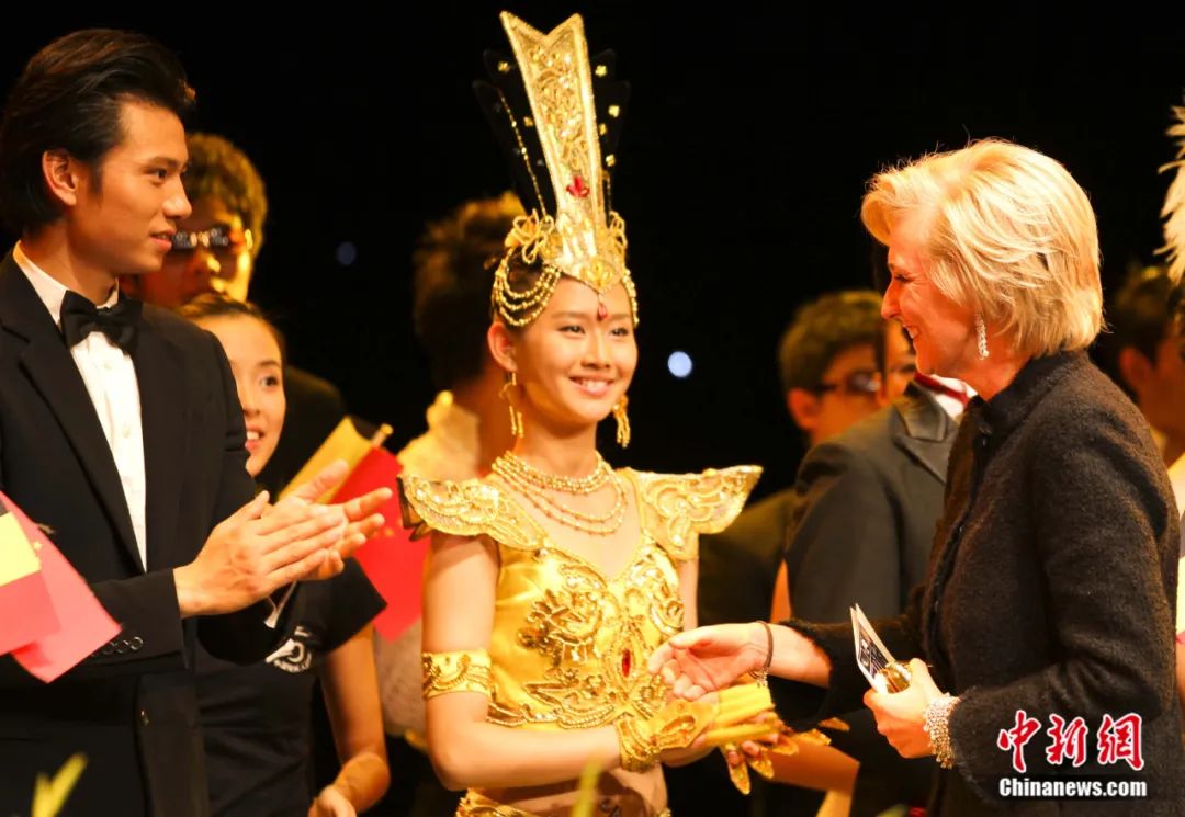 2011年9月,比利時公主阿斯特里德(右)在布魯塞爾觀看中國殘疾人藝術(shù)團(tuán)傾情奉獻(xiàn)的演出——《我的夢》。圖為阿斯特里德公主向演員致謝。沈晨 攝