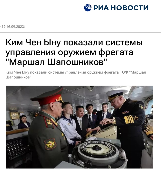 隨后,金正恩與紹伊古一行登上位于符拉迪沃斯托克的俄太平洋艦隊(duì)“沙波什尼科夫元帥”號護(hù)衛(wèi)艦,參觀了護(hù)衛(wèi)艦的導(dǎo)彈系統(tǒng)和火炮裝置。