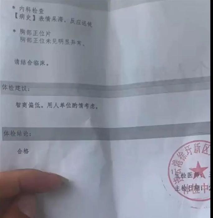 9月12日,有網(wǎng)友發(fā)布一則體檢報(bào)告視頻,內(nèi)科檢查一欄寫著“(病史)表情呆滯,反應(yīng)遲鈍”字樣,而在體檢建議一欄則寫著“智商偏低。用人單位酌情考慮”的內(nèi)容,而在胸部拍片一欄則完全正常,最終的體檢結(jié)論也是合格。