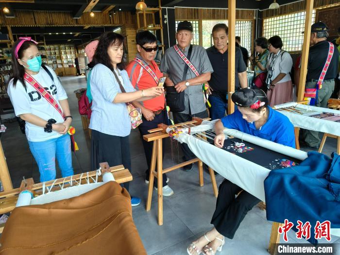 9月17日,來(lái)自臺(tái)灣花蓮縣光復(fù)鄉(xiāng)的村民在貴州西江千戶(hù)苗寨參觀苗繡制作。 邱軼軻 攝