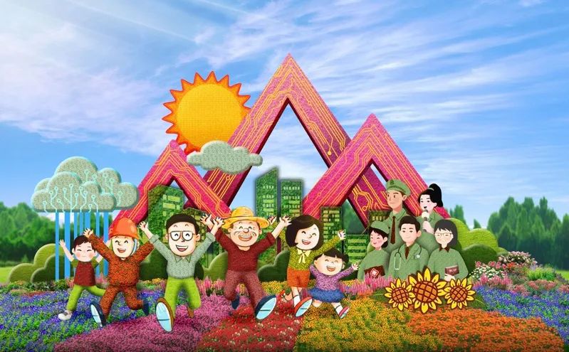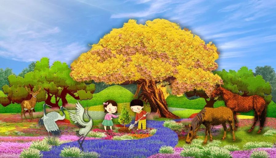 4. 東單西北角的“和諧共生”花壇頂高8.5米,以“三北工程”綠色長城為主景,配以野馬(西北)、麋鹿(華北)、白鶴(東北)、胡楊等典型物種,體現(xiàn)了生態(tài)治理的典范,寓意堅(jiān)定不移走好人與自然和諧共生的中國式現(xiàn)代化之路。
