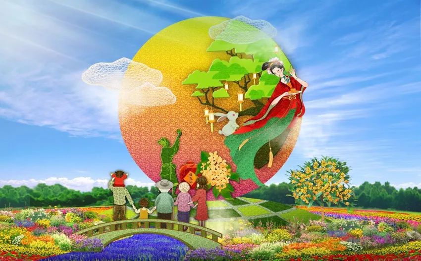 8. 西單西北角的“花好月圓”花壇頂高8米,以一家人中秋團(tuán)聚的溫馨畫面為場景,體現(xiàn)了花好月圓下的群眾幸福生活。