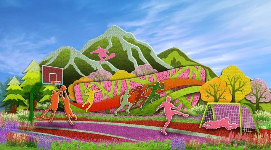 6. 西單東北角的“全民健身”花壇頂高8.5米,以豐富多彩的全民健身為題材,配以籃球、羽毛球、跑步、滑雪等運(yùn)動(dòng)場景,寓意全民健身共享美好生活。
