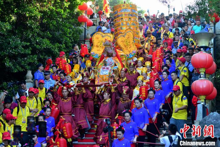 9月19日,湄洲媽祖金身在兩岸信眾的簇?fù)硐?,開啟十天九夜巡安莆田的布福之旅。中新社記者 張斌 攝