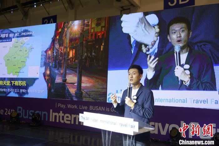 10月5日,第24屆釜山國際旅游展在韓國釜山國際會(huì)展中心開幕。圖為浙江文旅韓國推廣中心主任丁振哲介紹浙江省旅游資源。中新社記者 劉旭 攝