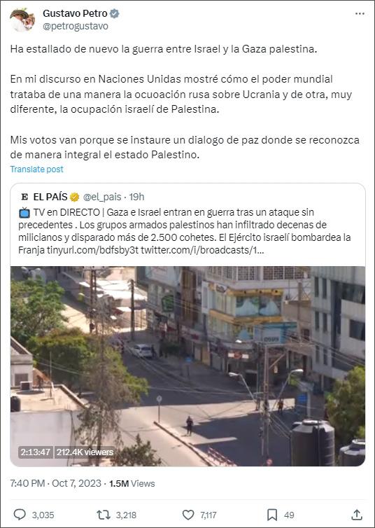 “以色列和巴勒斯坦在加沙地帶再次爆發(fā)戰(zhàn)爭。在聯(lián)合國的演講中,我曾展示了世界大國如何以一種方式對待俄羅斯對烏克蘭的占領(lǐng),但又以另一種截然不同的方式對待以色列對巴勒斯坦的占領(lǐng)。 ”佩特羅在社交媒體X發(fā)文說,“我支持建立和平對話,巴勒斯坦國將得到全面承認(rèn)?!?/p>