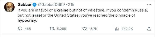 美國合眾國際社(UPI)報道注意到,有很多媒體專欄作者和社交媒體用戶都指出了西方在俄烏沖突等問題上的“虛偽行為”,佩特羅并不是唯一一位。例如一名認(rèn)證為“作家”的社交媒體用戶寫道:“如果你支持烏克蘭而不支持巴勒斯坦,如果你譴責(zé)俄羅斯卻不譴責(zé)以色列或美國,那么你就已經(jīng)達(dá)到了虛偽的頂峰。”
