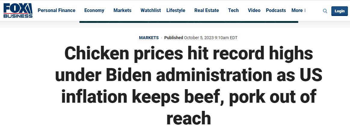 另據(jù)美國??怂股虡I(yè)頻道(Fox Business)網(wǎng)站報道,受到持續(xù)通貨膨脹影響,美國牛肉和豬肉價格保持高位,普通消費(fèi)者不得不轉(zhuǎn)向略微便宜一些的雞肉。然而,全美零售店的雞肉價格也隨著需求量的增加而水漲船高,更是創(chuàng)下歷史新高,并且預(yù)計還將保持在高位。