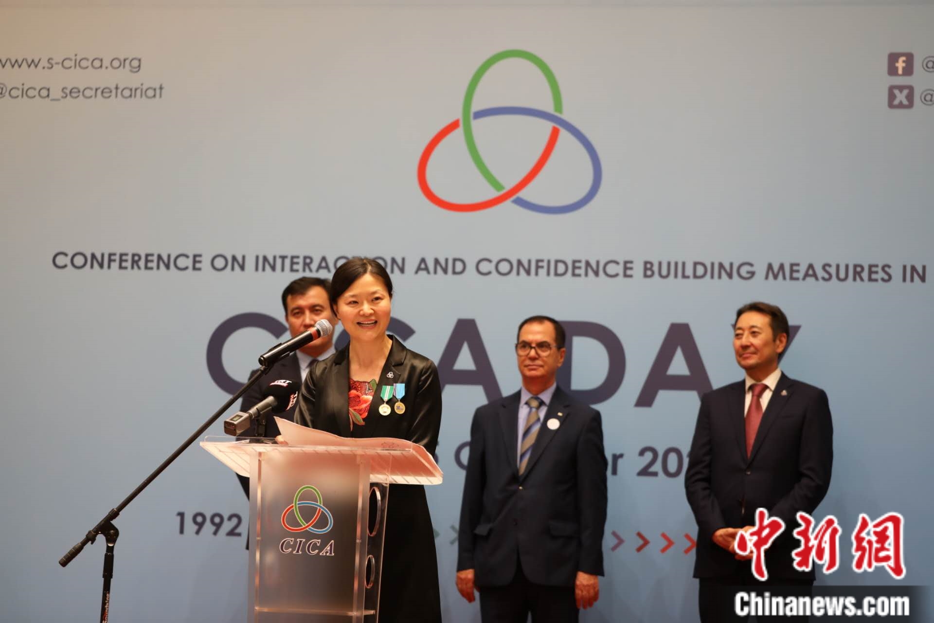 10月5日,哈薩克斯坦阿斯坦納,亞洲相互協(xié)作與信任措施會(huì)議秘書處舉辦成立31周年招待會(huì)。圖為亞信會(huì)議副秘書長遲方被授予總統(tǒng)頒發(fā)的國家獎(jiǎng)?wù)?。亞信?huì)議秘書處供圖