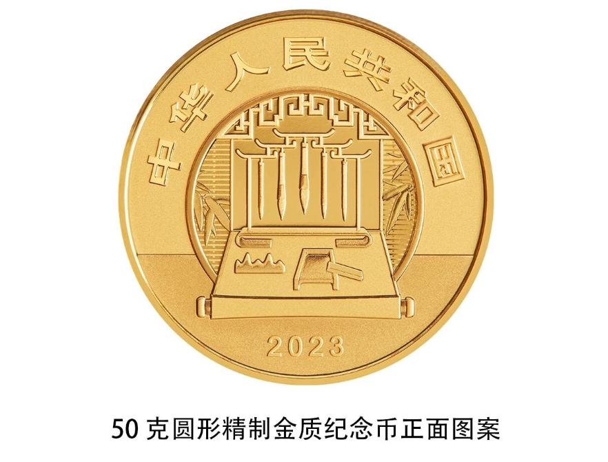 4枚圓形金銀紀(jì)念幣正面圖案均為筆、墨、紙、硯造型,輔以竹葉、窗等裝飾組合設(shè)計,并刊國名、年號。