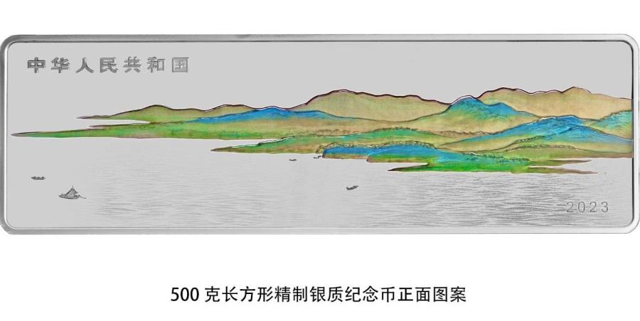500克長方形銀質(zhì)紀(jì)念幣正面圖案為山、水等組合設(shè)計,并刊國名、年號。