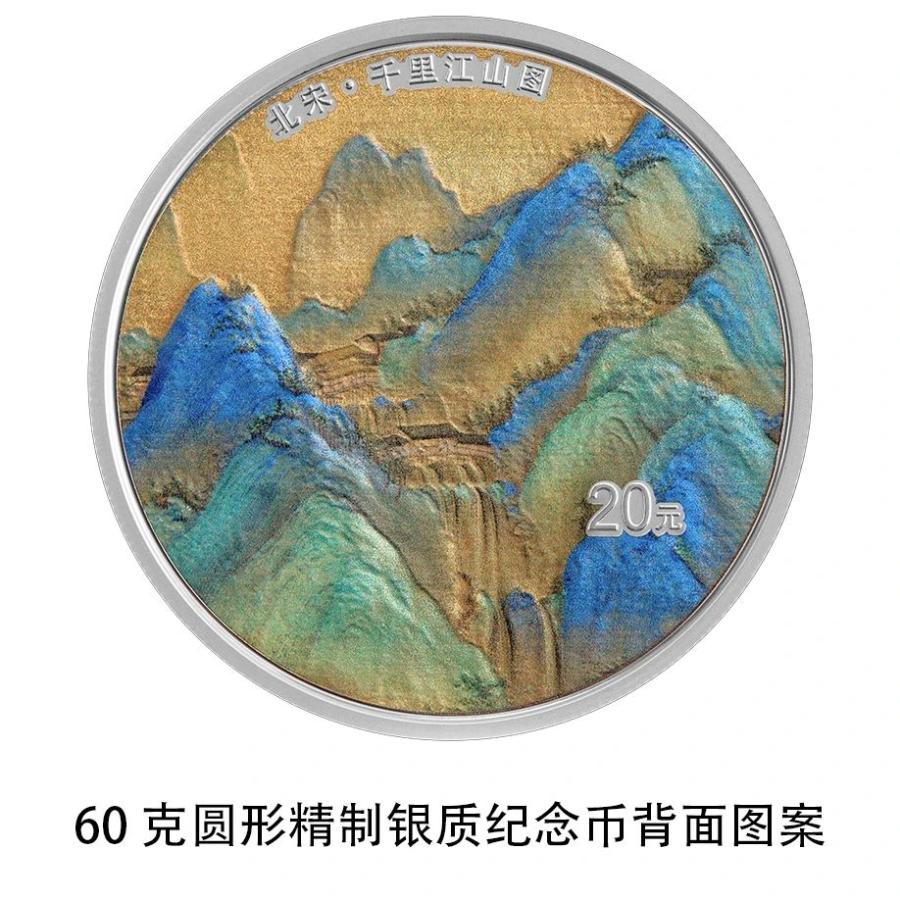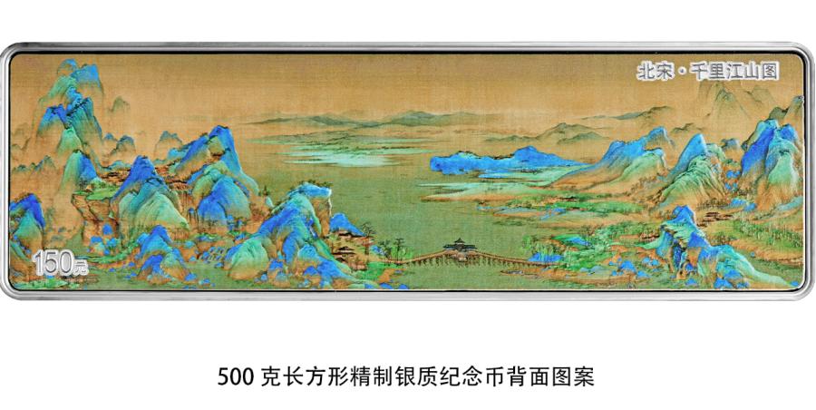 該套金銀紀(jì)念幣背面圖案均為《千里江山圖》局部場景,并刊“北宋·千里江山圖”字樣及面額。