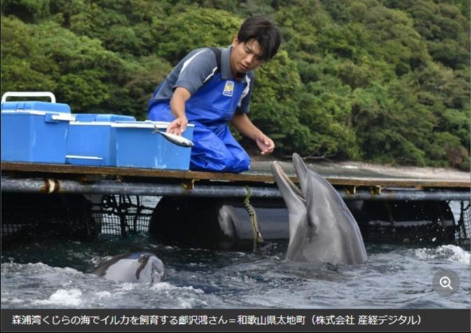 在“森浦灣鯨之?!憋曫B(yǎng)海豚的鄭澤鴻。圖片來源于《產(chǎn)經(jīng)新聞》報道截圖。