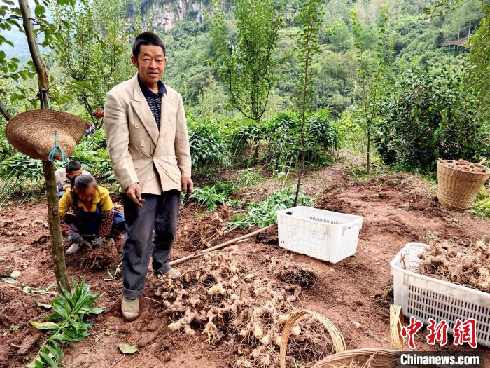 圖為華溪村村民、產(chǎn)業(yè)帶頭人陳朋(右1)站在挖掘收獲的黃精邊上。中新網(wǎng)記者劉賢 攝