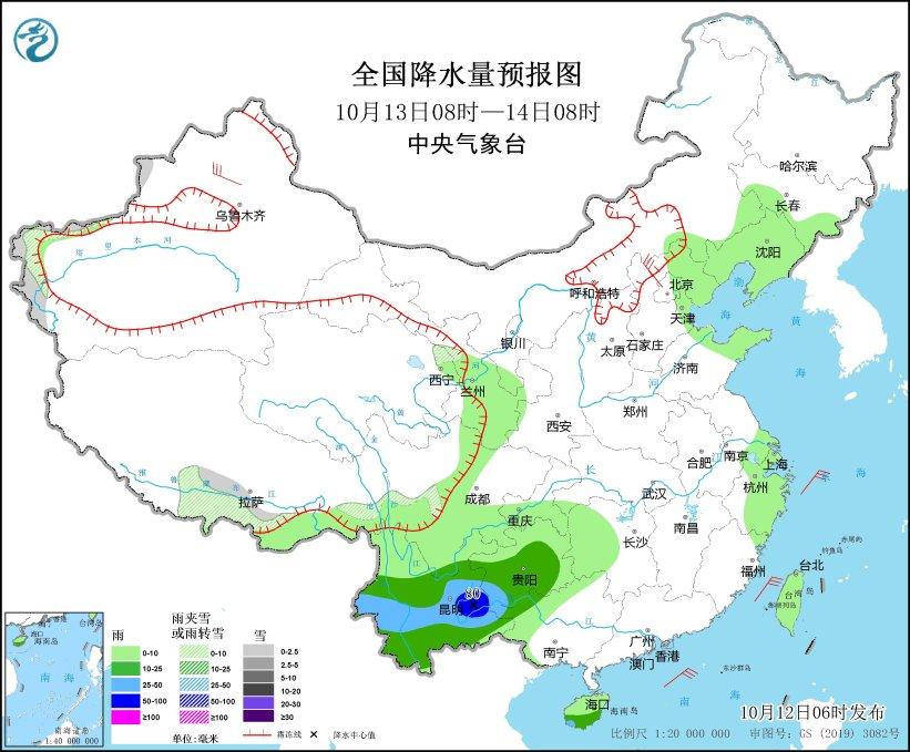 10月12日08時(shí)至13日08時(shí),西藏東部、青海北部和東部、甘肅西部、川西高原西北部等地部分地區(qū)有小到中雪或雨夾雪;西藏東南部、四川南部、貴州西部、云南中西部及海南島中東部等地部分地區(qū)有中到大雨,其中,云南西部局地有暴雨(50~60毫米)。西藏中部、四川盆地北部、河北北部等地部分地區(qū)有4-6級風(fēng);東海大部海域、臺(tái)灣海峽、臺(tái)灣以東洋面、巴士海峽、南海北部和中部海域、北部灣等海域有5~7級風(fēng)、陣風(fēng)8級。(見圖1)。