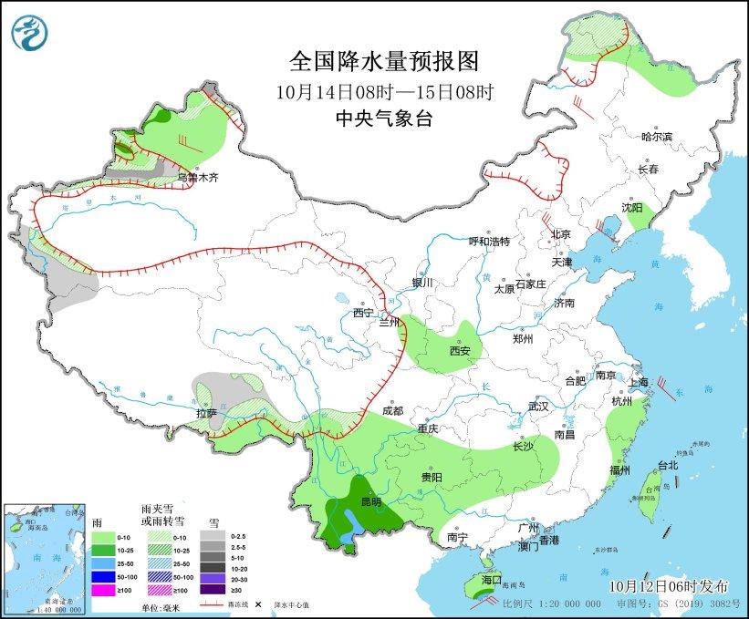 10月14日08時(shí)至15日08時(shí),內(nèi)蒙古東北部、新疆西部、西藏南部等地部分地區(qū)有小到中雪或雨夾雪;黑龍江西北部、遼寧東部、陜西南部、甘肅東南部、四川南部、貴州大部、云南、廣西西部、湖南中南部、江西西南部、浙江中東部、福建東部、海南島及臺(tái)灣島等地部分地區(qū)有小到中雨,其中,云南南部局地有大雨。內(nèi)蒙古東北部、新疆西北部、河北北部等地部分地區(qū)有5~6級風(fēng);渤海、渤海海峽等海域有6~7級風(fēng)、陣風(fēng)8~9級。(見圖3)。