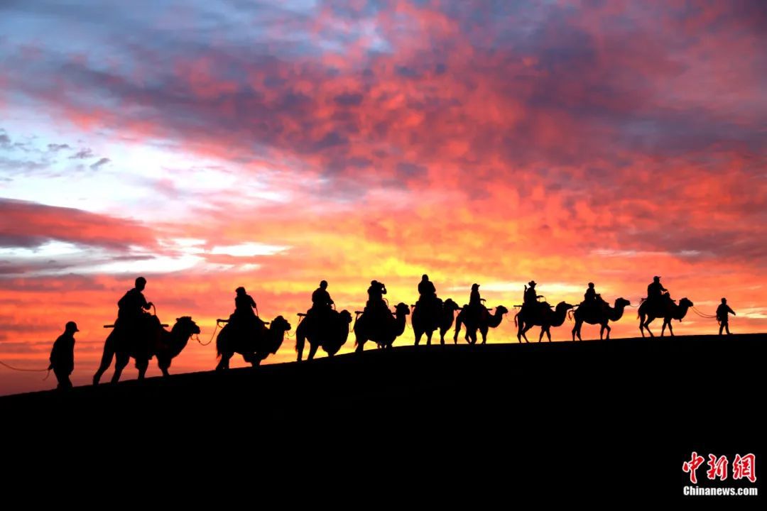甘肅敦煌鳴沙山下的駱駝紅綠燈。楊艷敏 攝