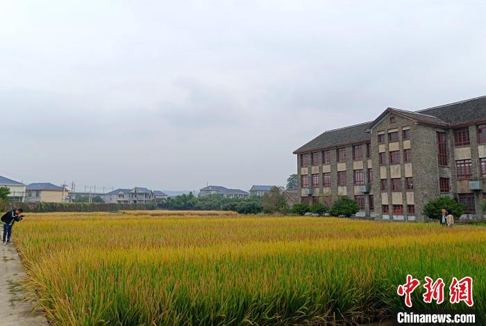10月13日,安江農(nóng)校紀念園內(nèi),袁隆平曾發(fā)現(xiàn)水稻“天然雄性不育株”的試驗田里,金黃的稻穗隨風(fēng)搖曳。這里如今仍是科研人員開展雜交水稻研究的“陣地”。中新社記者 鄧霞 攝