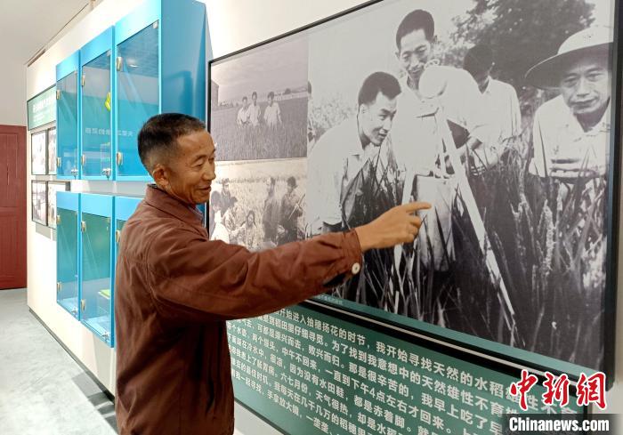 10月13日,在安江農(nóng)校紀念園內(nèi)的雜交水稻發(fā)源地紀念館,袁隆平的學(xué)生宋澤觀講述袁隆平及其團隊研究雜交水稻的故事。中新社記者 鄧霞 攝