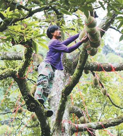 威猜站在十幾米高的榴蓮樹上,揮刀砍斷榴蓮與樹杈連接處,幾公斤重的榴蓮落了下來(lái)。樹底下,他的同伴緊盯著一個(gè)個(gè)從天而降的“刺球”,在它們落地前一瞬間,張開麻袋,穩(wěn)穩(wěn)兜住。不一會(huì)兒,地上就碼放了一排榴蓮。