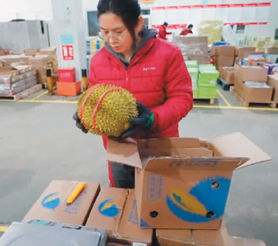 兩個(gè)多小時(shí)后,在北京市海淀區(qū)的一個(gè)快遞站點(diǎn),京東快遞員侯建東從傳送帶上拿到了一箱榴蓮。