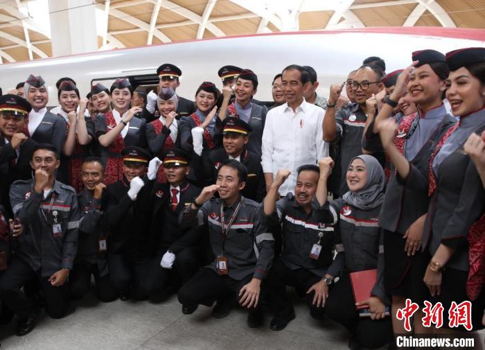 9月13日,印度尼西亞總統(tǒng)佐科考察中印尼合作項(xiàng)目雅萬高鐵,并在哈利姆站乘坐G5901次高鐵列車赴帕達(dá)拉朗站。這是他首次乘坐雅萬高鐵。圖為佐科在哈利姆站與乘務(wù)人員合影。 中新社記者 李志全 攝