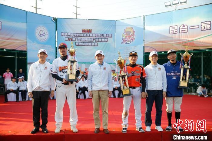 “昆山媽祖杯”海峽兩岸慢速壘球邀請賽已成為昆山的代表性體育賽事。圖為2021年10月24日,嘉賓在閉幕式上為獲得競技組前三名的球隊頒獎并合影。中新社記者 王駿 攝