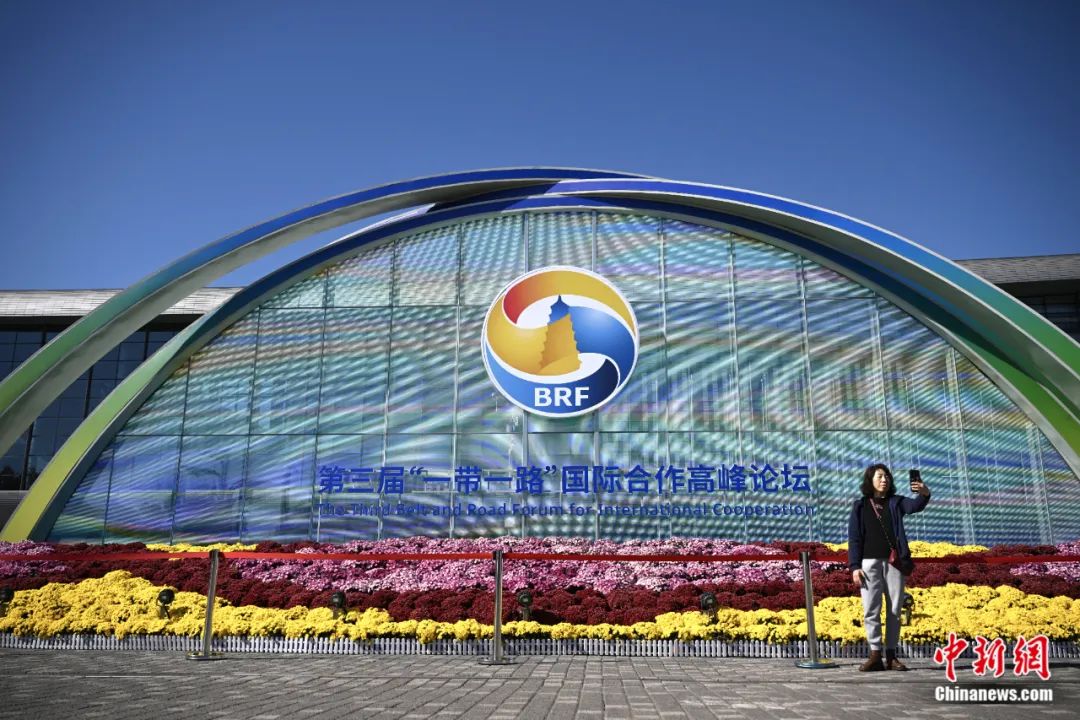 2023年10月14日,市民在北京市一處第三屆“一帶一路”國(guó)際合作高峰論壇元素裝置前拍照。第三屆“一帶一路”國(guó)際合作高峰論壇將于10月17日至18日在北京舉行。趙文宇 攝
