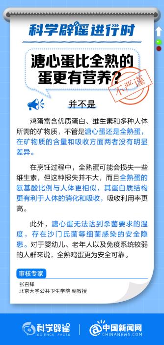 中新網(wǎng)10月20日電 溏心蛋和全熟蛋在礦物質(zhì)的含量和吸收方面沒有明顯差異。在烹飪過程中,全熟蛋可能會(huì)損失一些維生素,但這種損失并不大,而且全熟蛋的氨基酸比例與人體更相似,其蛋白質(zhì)結(jié)構(gòu)更有利于人體的消化和吸收。此外,溏心蛋無法達(dá)到殺菌要求的溫度,存在沙門氏菌等細(xì)菌感染的安全隱患。(來源:@科學(xué)辟謠 @中國新聞網(wǎng) )