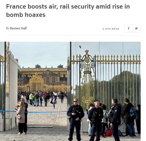 當(dāng)?shù)貢r(shí)間19日,法國(guó)14個(gè)機(jī)場(chǎng)收到炸彈威脅,至少9個(gè)機(jī)場(chǎng)進(jìn)行疏散。凡爾賽宮也在不到一周的時(shí)間內(nèi)第4次進(jìn)行疏散。