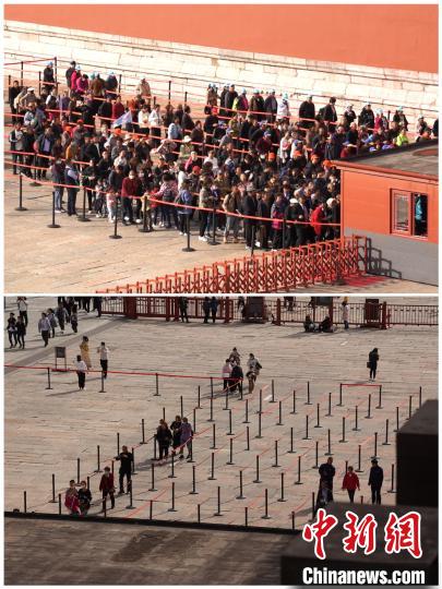 上圖為10月20日9時許,故宮博物院午門外檢票現(xiàn)場;下圖為10月19日13時許,故宮博物院午門外檢票現(xiàn)場?!」蕦m博物院供圖