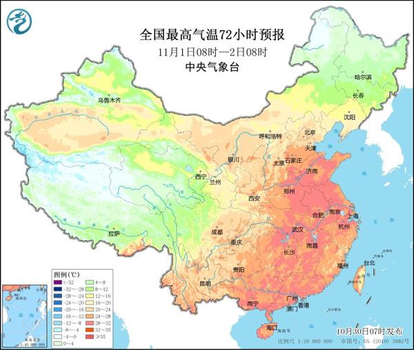 本周前期,中東部升溫還將繼續(xù)。 預(yù)計(jì)本周初,全國(guó)大部仍會(huì)以升溫為主,并且大幅偏離常態(tài)。特別是華北、黃淮一帶,11月初暖熱程度還會(huì)升級(jí),部分地區(qū)最高氣溫甚至?xí)^(guò)30℃部分,比如,鄭州,菏澤等地可能在11月1日前后迎來(lái)當(dāng)?shù)?1月觀測(cè)史上的首個(gè)30℃。