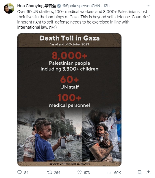 據(jù)報(bào)道,當(dāng)天,華春瑩發(fā)帖提及加沙地帶的人員傷亡。她稱,“超過60名聯(lián)合國工作人員、100名醫(yī)務(wù)工作者、8000名巴勒斯坦人在對(duì)加沙的轟炸中喪生。這超出了自衛(wèi)的范圍。各國擁有的自衛(wèi)權(quán)須依據(jù)國際法行使?!?/p>