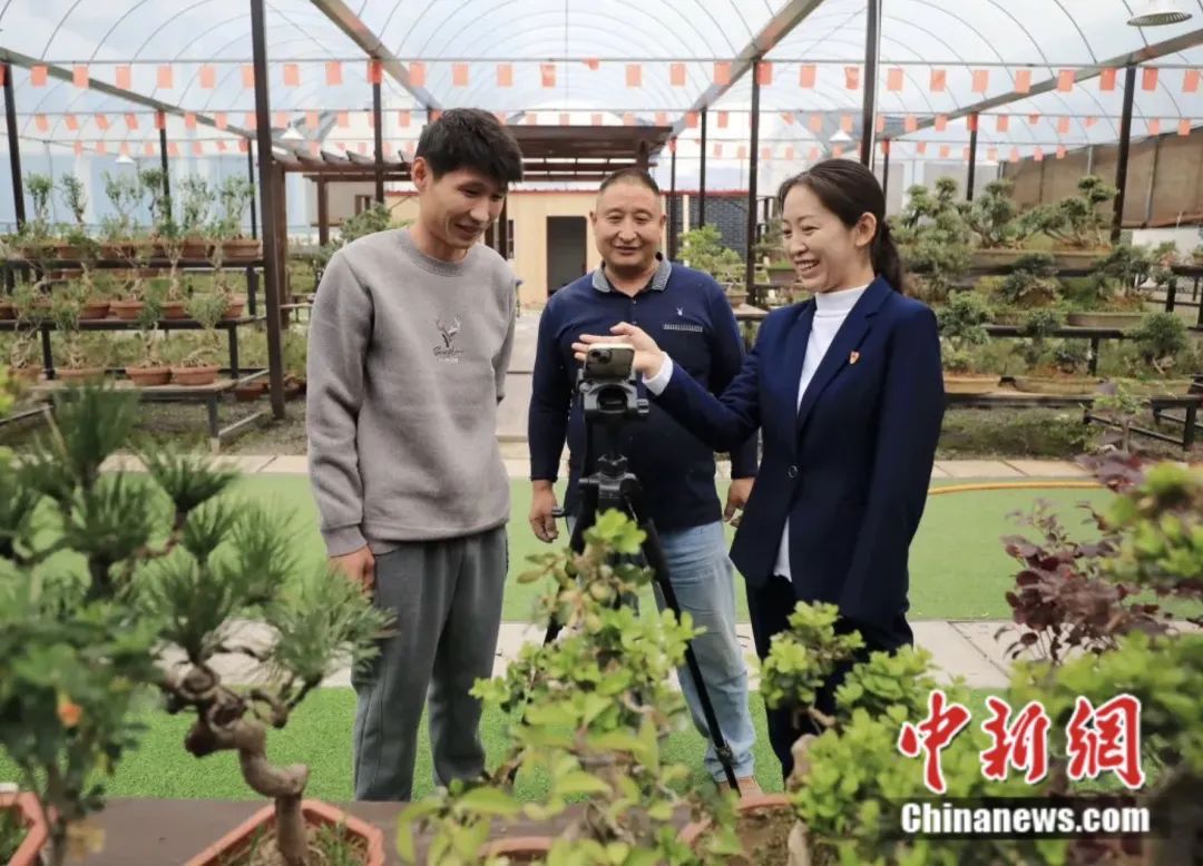 午后,在“中國(guó)盆景淘寶第一村”新河鎮(zhèn)周圈村,花農(nóng)姜愛(ài)花忙著給一株刺柏“盛裝打扮”,晚上,這株刺柏會(huì)被送往該村的“花木集市”,數(shù)十名主播將對(duì)其直播競(jìng)拍。