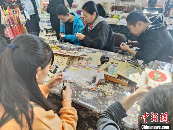 在撫順市非物質(zhì)文化遺產(chǎn)布貼畫助殘培訓(xùn)基地,殘疾人制作布貼畫。王晨 攝