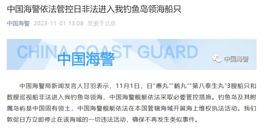 中新網(wǎng)11月1日電 據(jù)中國(guó)海警微博消息,中國(guó)海警局新聞發(fā)言人甘羽表示,11月1日,日“惠丸”“鶴丸”“第八泰生丸”3艘船只和數(shù)艘巡視船非法進(jìn)入我釣魚島領(lǐng)海,中國(guó)海警艦艇依法采取必要管控措施。釣魚島及其附屬島嶼是中國(guó)固有領(lǐng)土,中國(guó)海警艦艇依法在本國(guó)管轄海域開展海上維權(quán)執(zhí)法活動(dòng)。我們敦促日方立即停止在該海域的一切違法活動(dòng),確保不再發(fā)生類似事件。