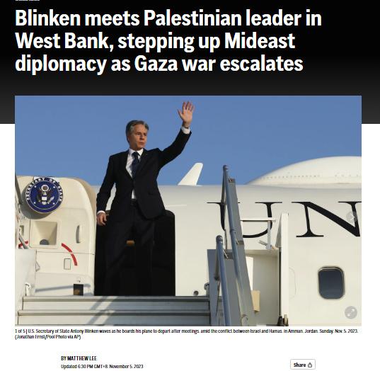 據(jù)報(bào)道,這是本輪巴以沖突爆發(fā)以來(lái),美國(guó)最高級(jí)別外交官首次到訪約旦河西岸。