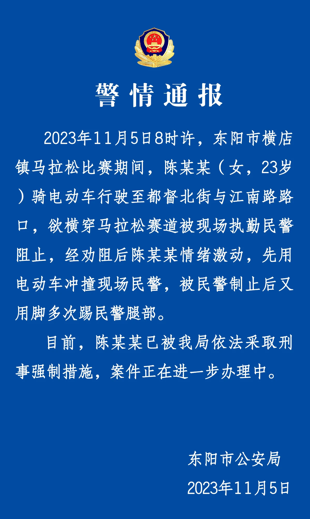 中新網(wǎng)金華11月6日電(董易鑫)浙江金華東陽市公安局11月5日發(fā)布警情通報(bào)稱,2023年11月5日8時(shí)許,東陽市橫店鎮(zhèn)馬拉松比賽期間,陳某某(女,23歲)騎電動車行駛至都督北街與江南路路口,欲橫穿馬拉松賽道被現(xiàn)場執(zhí)勤民警阻止,經(jīng)勸阻后陳某某情緒激動,先用電動車沖撞現(xiàn)場民警,被民警制止后又用腳多次踢民警腿部。