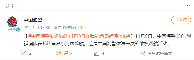 中新網(wǎng)11月9日電 據(jù)中國(guó)海警局官方微博消息,11月9日,中國(guó)海警1301艦艇編隊(duì)在我釣魚島領(lǐng)海內(nèi)巡航。這是中國(guó)海警依法開展的維權(quán)巡航活動(dòng)。