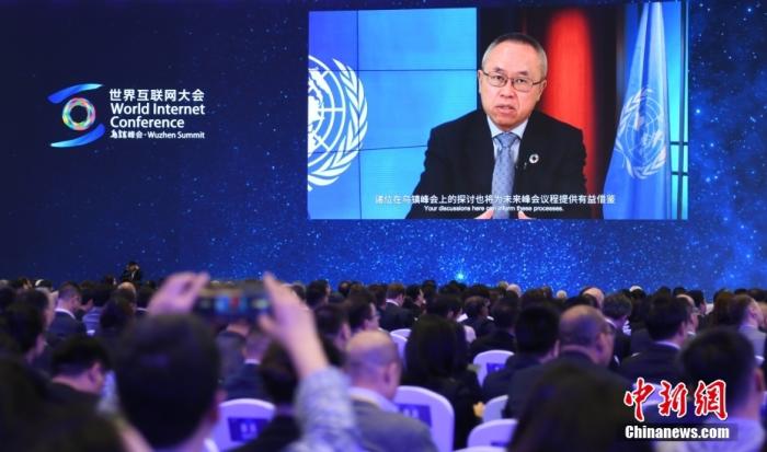 2023年11月8日,2023年世界互聯(lián)網(wǎng)大會(huì)烏鎮(zhèn)峰會(huì)在浙江烏鎮(zhèn)開幕,主題為“建設(shè)包容、普惠、有韌性的數(shù)字世界——攜手構(gòu)建網(wǎng)絡(luò)空間命運(yùn)共同體”。圖為聯(lián)合國副秘書長李軍華視頻演講。