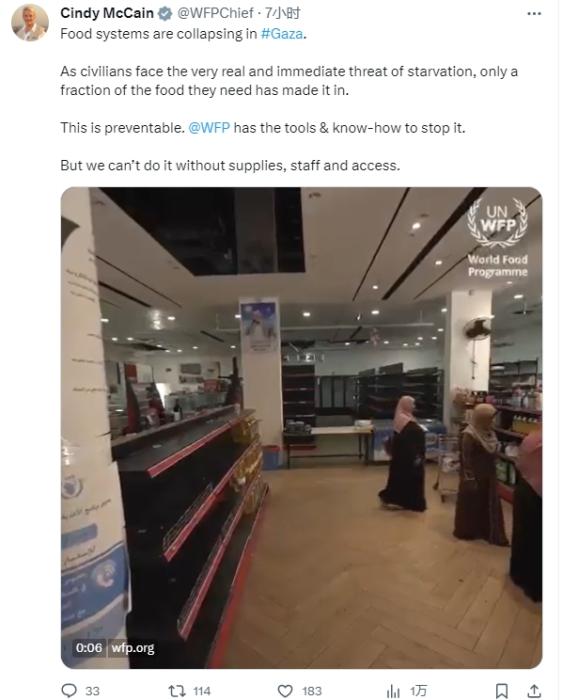 世界糧食計劃署發(fā)文表示,自新一輪沖突開始以來,進入加沙的糧食只能滿足該地區(qū)百分之十的需求,加沙地帶現(xiàn)在面臨著巨大的糧食缺口和普遍的饑餓威脅。
