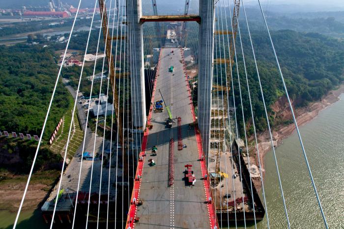 斜拉和懸索組合,強(qiáng)強(qiáng)聯(lián)合,牢固度加倍。大橋采用的這種構(gòu)建形態(tài),有效減少了江中橋墩對(duì)航運(yùn)的影響。中鐵大橋局項(xiàng)目部黨工委副書記張馳對(duì)中新網(wǎng)記者介紹,這種設(shè)計(jì)的優(yōu)點(diǎn)是跨度大、剛性強(qiáng)、成本低,未來將被廣泛采納和使用。