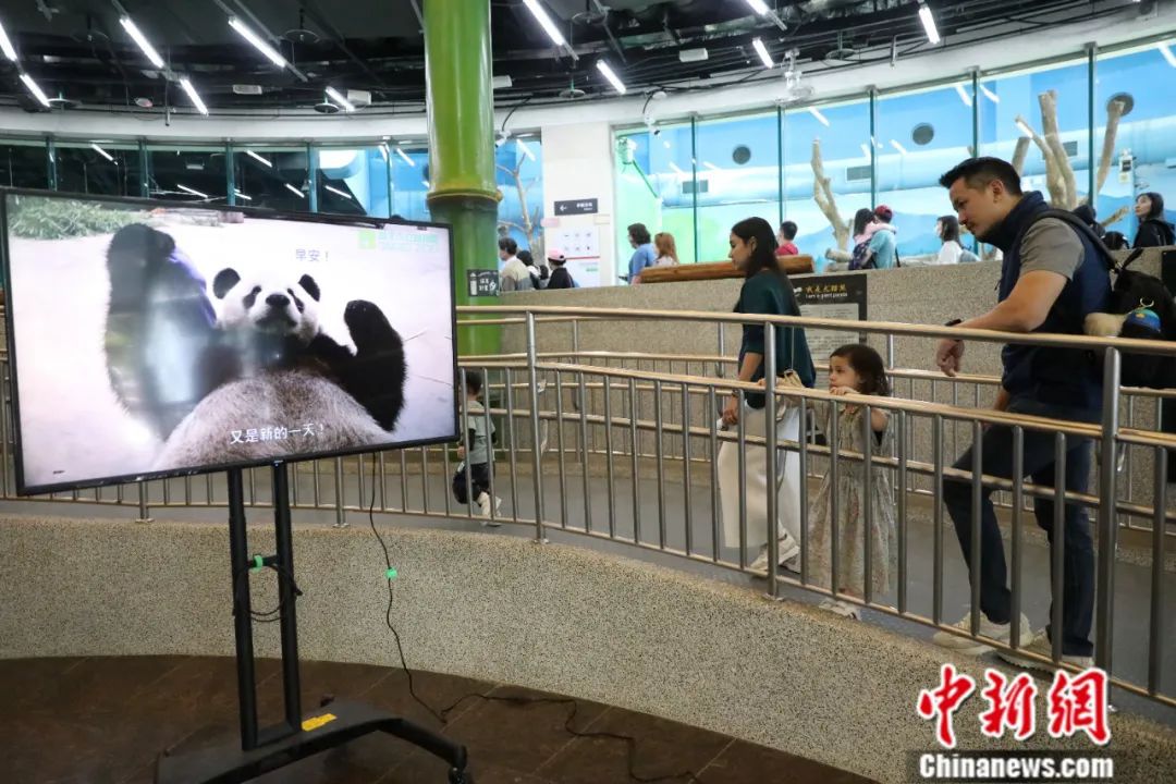 11月19日,民眾來到臺北動物園緬懷“團團”。圖為現(xiàn)場播放“團團”一家回顧影片。中新社記者 陳小愿 攝