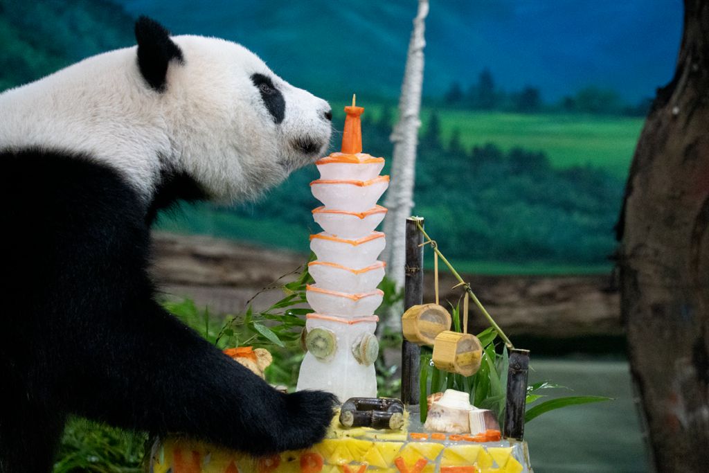“圓仔”享用保育員準(zhǔn)備的特制“蛋糕”,喜迎10歲生日。(臺北動物園提供/中時新聞網(wǎng))