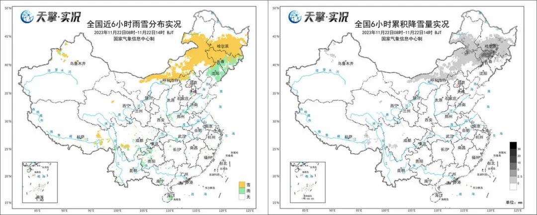 實(shí)況數(shù)據(jù)顯示,今天白天,內(nèi)蒙古中東部以及東北地區(qū)大部都出現(xiàn)了雨雪天氣,其中,內(nèi)蒙古中東部、黑龍江中南部一帶以降雪為主,吉林、遼寧等地以降雨為主;黑龍江最強(qiáng)降雪集中在哈爾濱,尚志6小時(shí)降雪量超10毫米,達(dá)到暴雪以上量級。