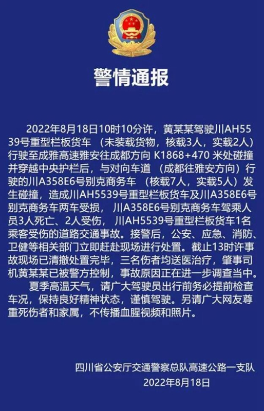 2022年8月18日10時(shí)10分許,G5京昆高速公路成雅段K1868公里+150米路段(成都市蒲江縣境內(nèi))發(fā)生川 AH55**貨車沖斷中央護(hù)欄與對(duì)向正常行駛的川A35***小客車發(fā)生碰撞,造成小客車內(nèi)3人當(dāng)場(chǎng)死亡,小客車內(nèi)2人和大貨車內(nèi)1人受傷、2車及高速公路路產(chǎn)受損的道路交通事故,直接經(jīng)濟(jì)損失約350萬元。