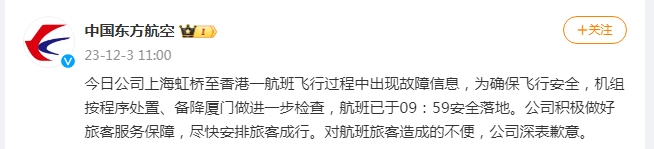 中新網(wǎng)12月3日電 據(jù)中國(guó)東方航空官方微博消息,3日該司上海虹橋至香港一航班飛行過(guò)程中出現(xiàn)故障信息,為確保飛行安全,機(jī)組按程序處置、備降廈門做進(jìn)一步檢查,航班已于09:59安全落地。
