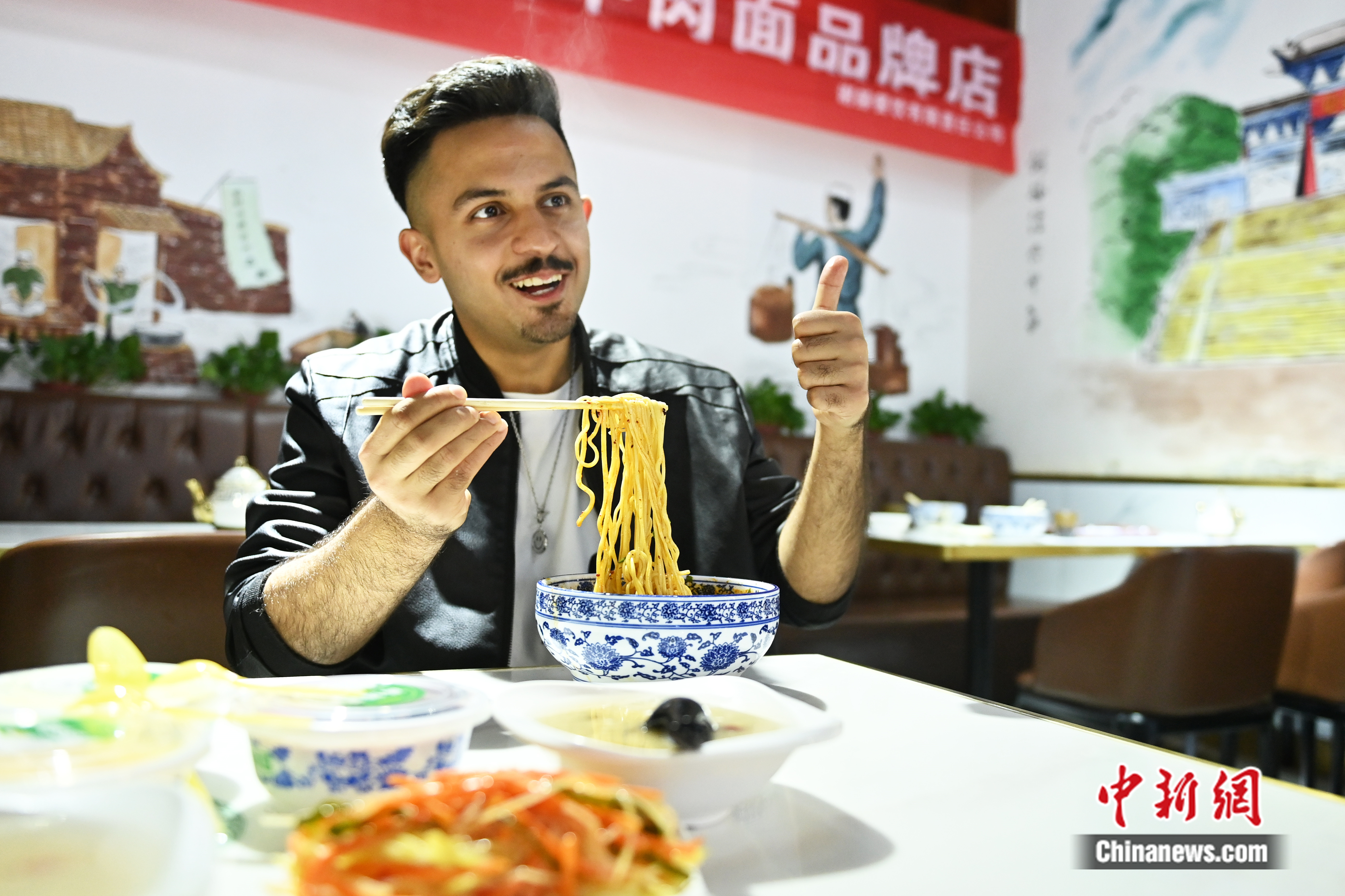蘭州理工大學(xué)留學(xué)生潘迪在面館點(diǎn)贊蘭州美食。中新網(wǎng)記者 李亞龍 攝