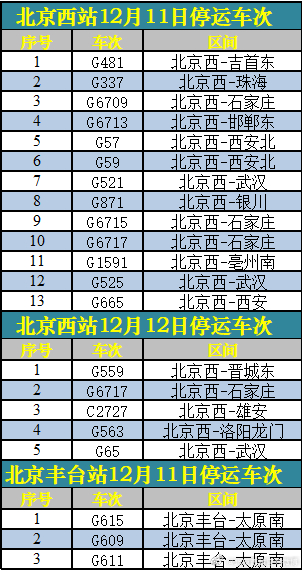 中新網(wǎng)12月11日電 據(jù)北京西站官方微博消息,受降雪影響,12月11日、12月12日北京西站、北京豐臺站部分列車停運,已購買停運列車車票的旅客,可于30日內(nèi)辦理全額退票手續(xù)。請廣大旅客合理安排出行,關(guān)注鐵路部門公告。